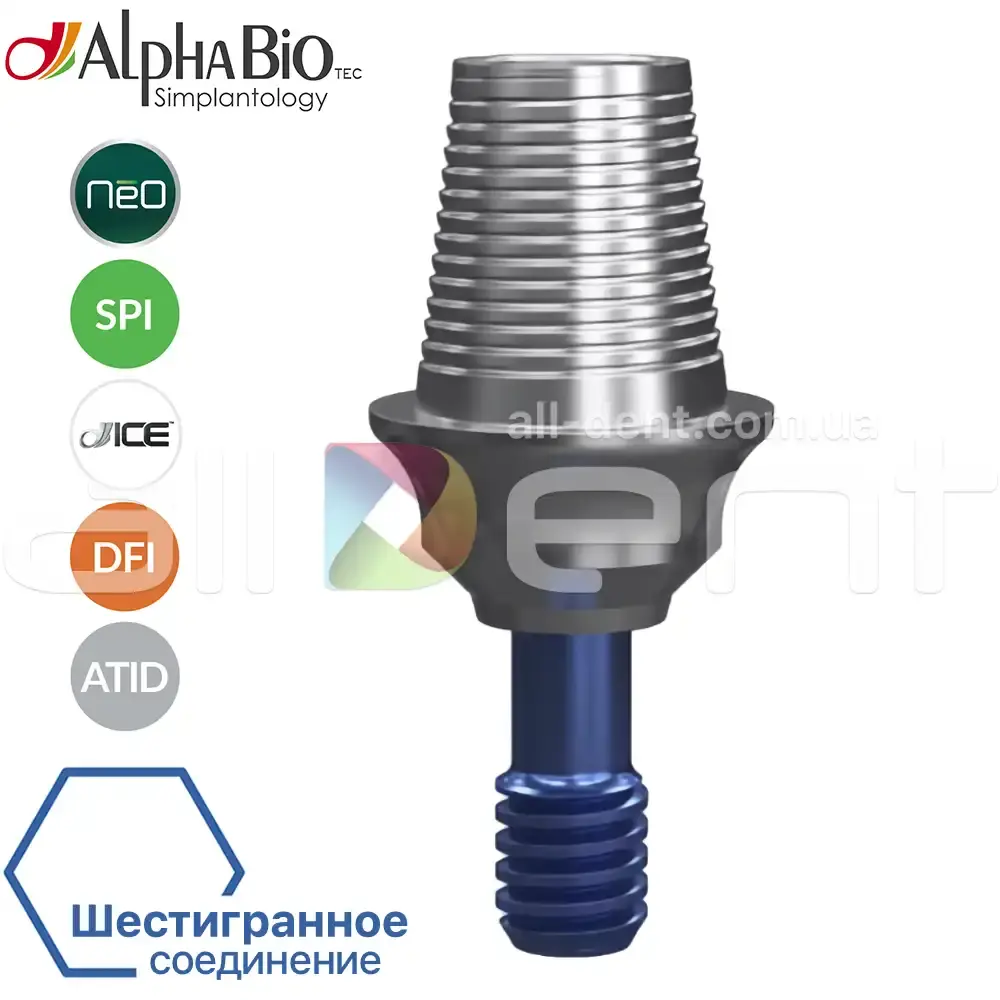 - Шестигранное и конусное соединение титановых платформ с имплантатами изготавливаются с идентичными допусками как и сами имплантаты AlphaBio, что обеспечивает максимальную точность посадки гибридного индивидуального абатмента в имплантат, а также максимальную надёжность в течение всего срока использования конструкции.